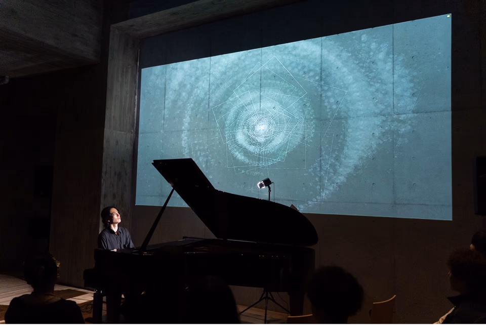 ピアノ演奏の音量・音域・テンポなどのパラメータをセンサーやマイクで取得し、そのリアルタイム情報をもとに映像を生成・変化させるシステムを導入。映像は演奏と同期してその場で描き出されるもので、音と映像が即興的に響き合う構成としました。 - 即興性と予測不能性の融合